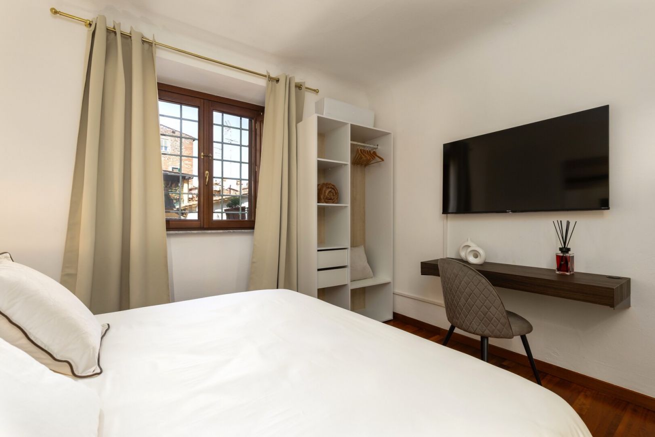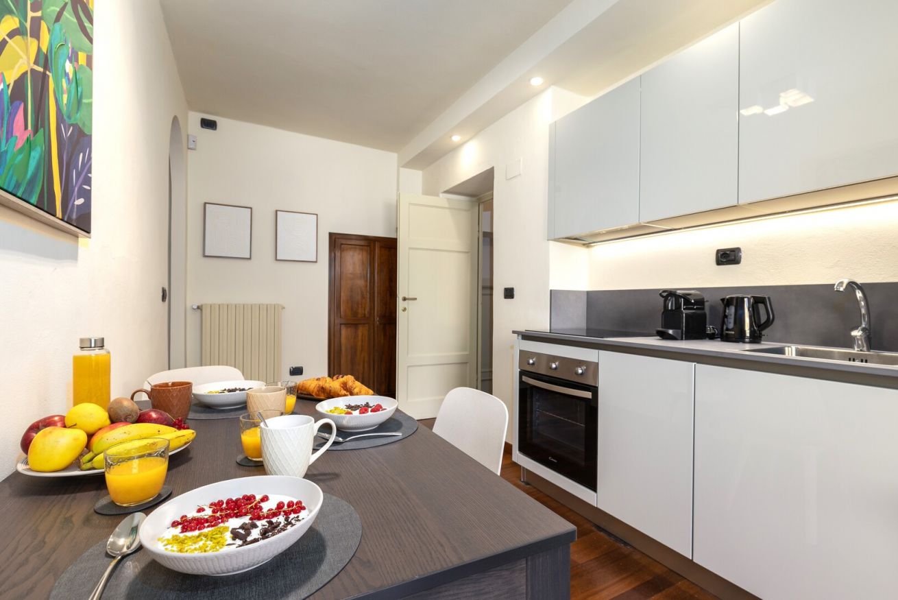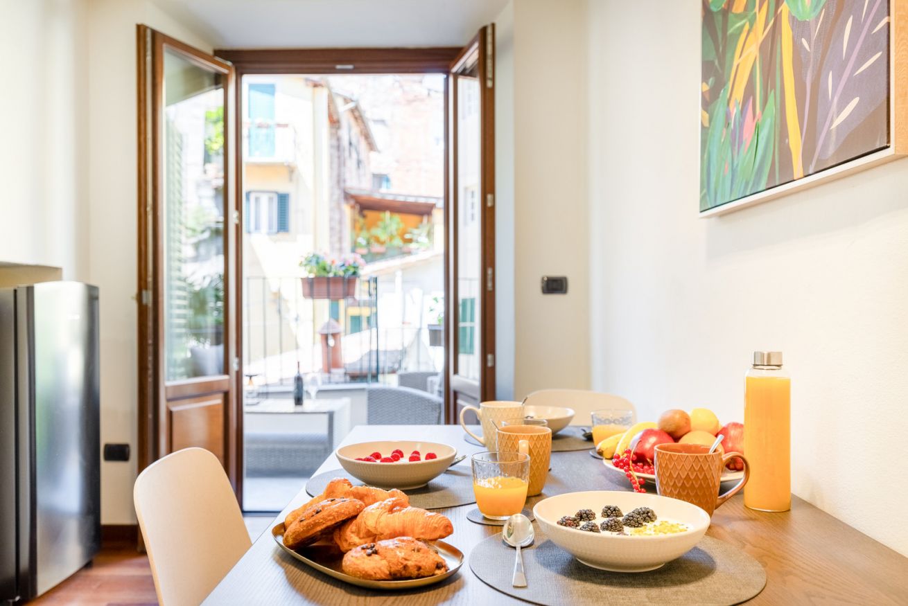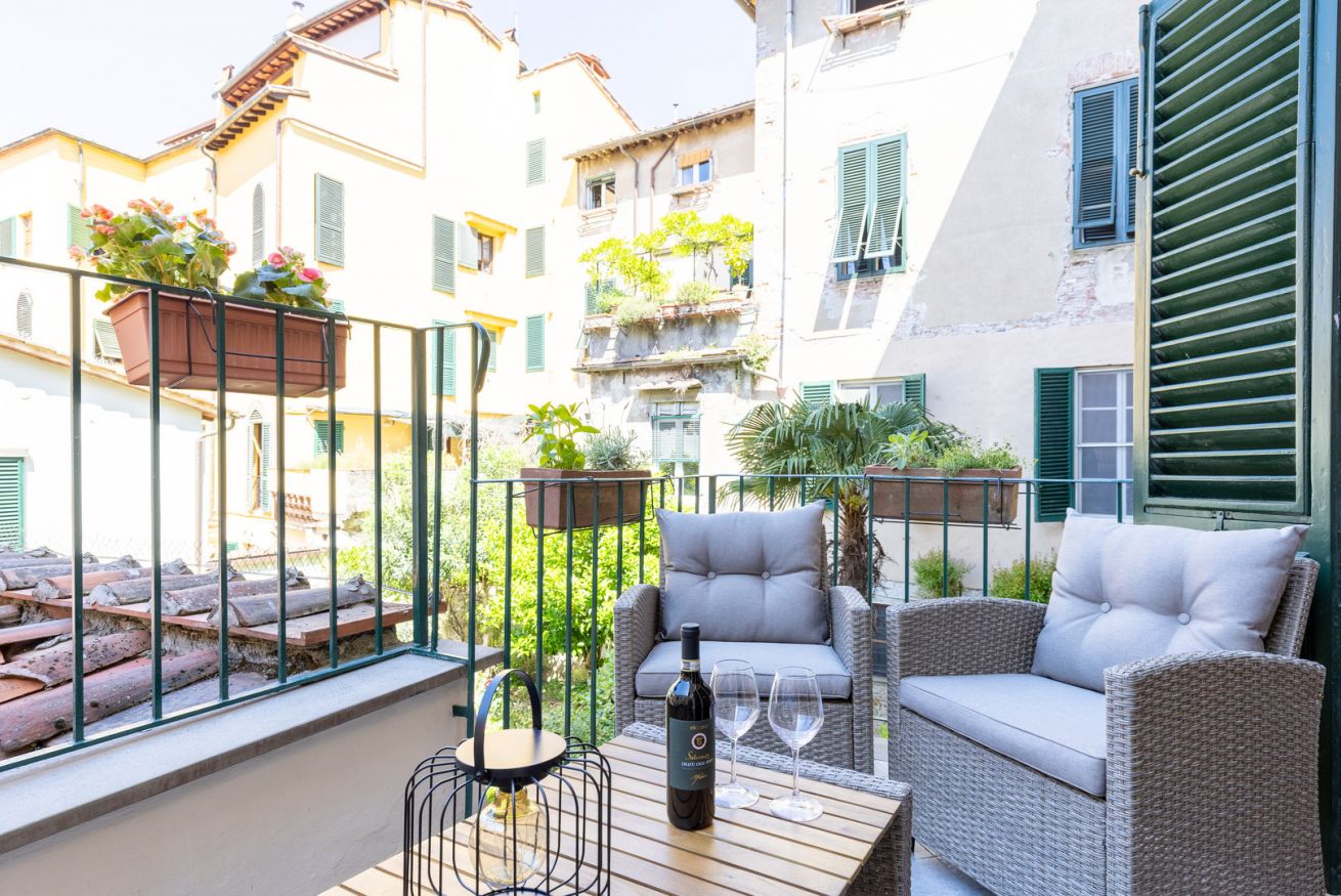 La cucina, moderna e completamente attrezzata con utensili ed elettrodomestici di alta gamma, si affaccia direttamente sul bellissimo terrazzo privato, un vero plus per chi desidera uno spazio esterno riservato nel cuore di Lucca: arredato con poltrone e tavolino, è il luogo perfetto per colazioni all’aperto, aperitivi al tramonto o semplici momenti di tranquillità.