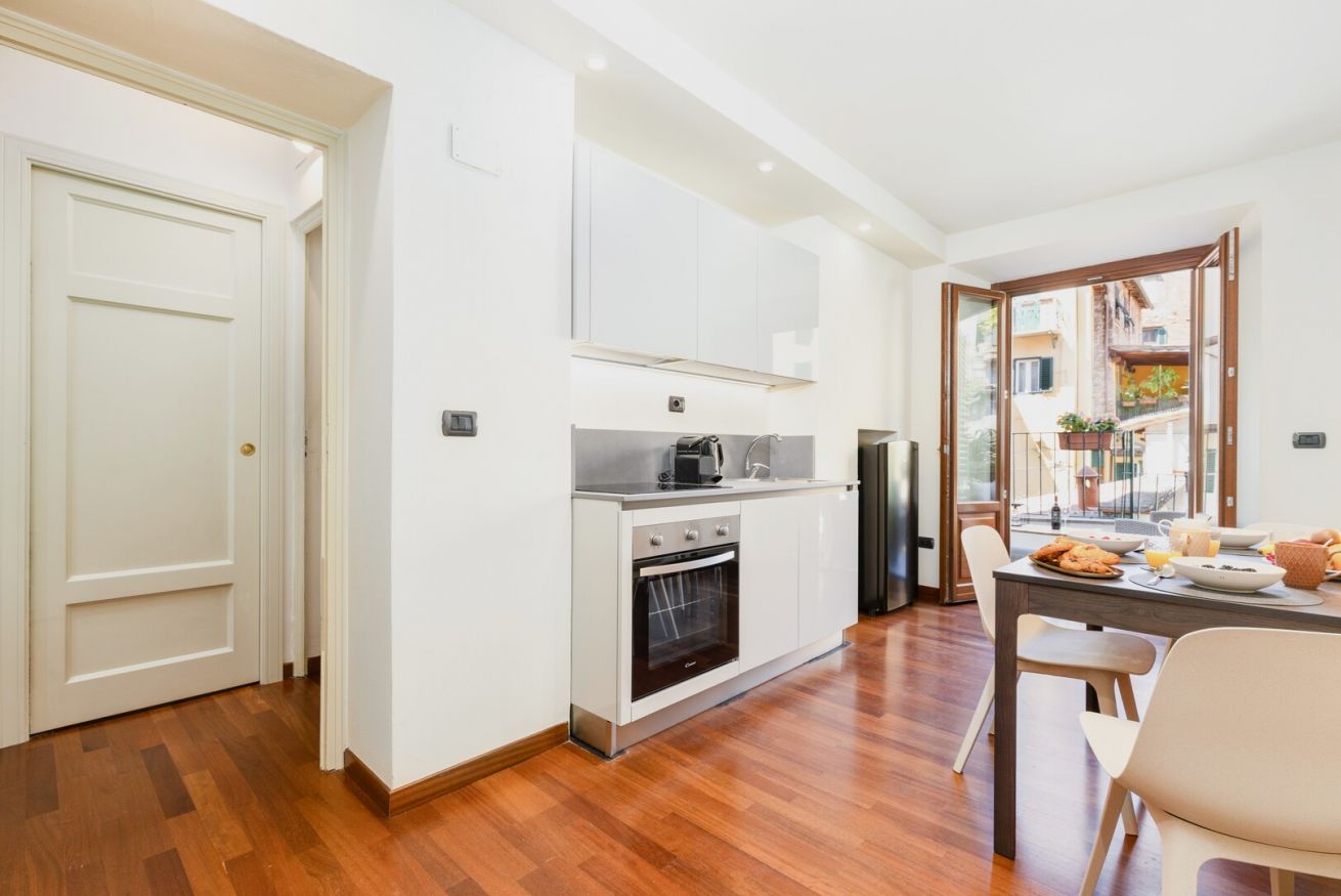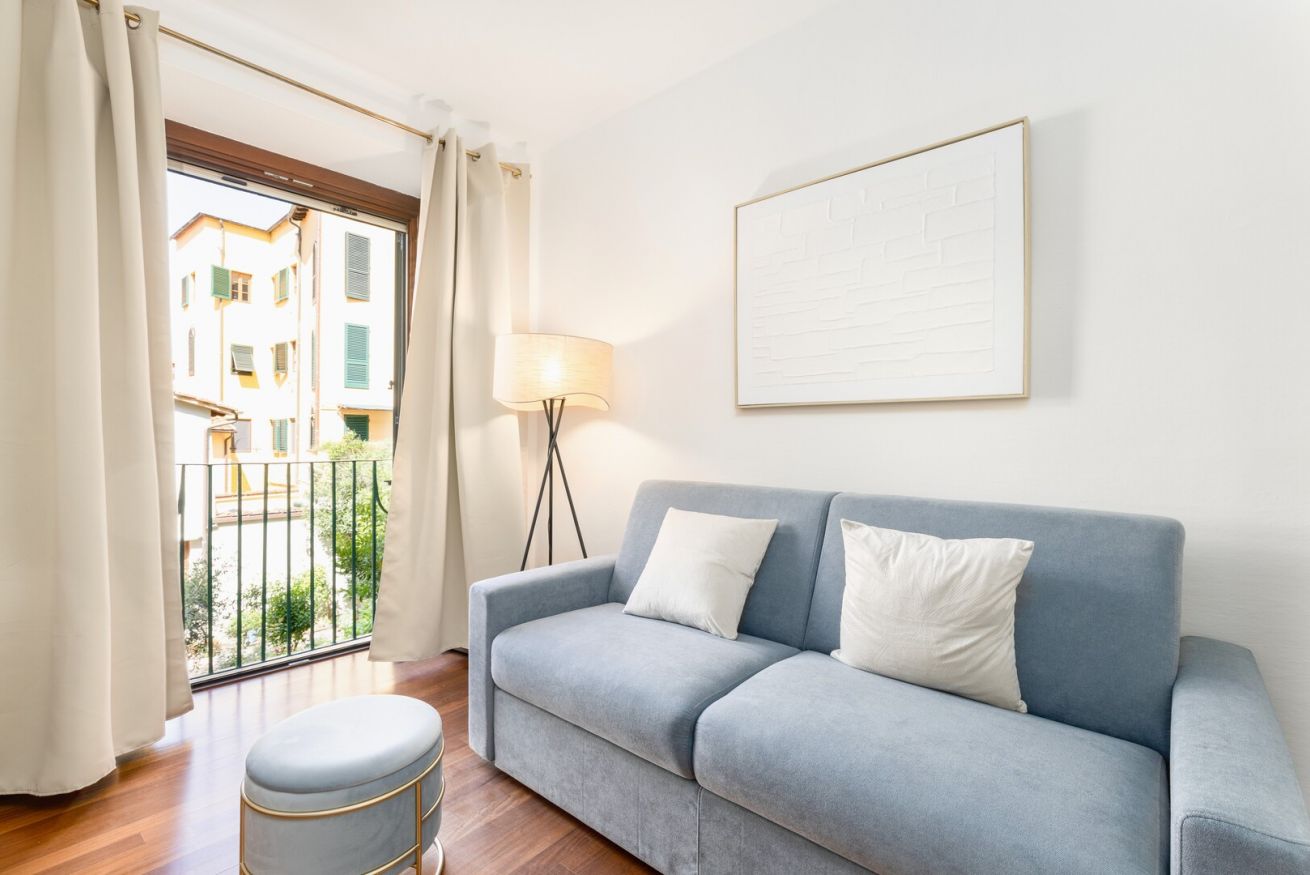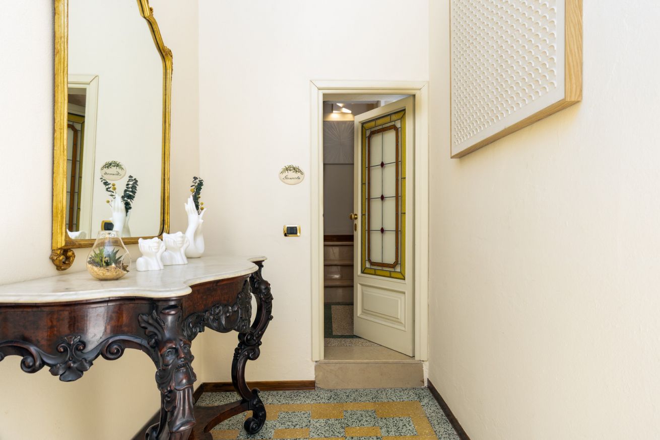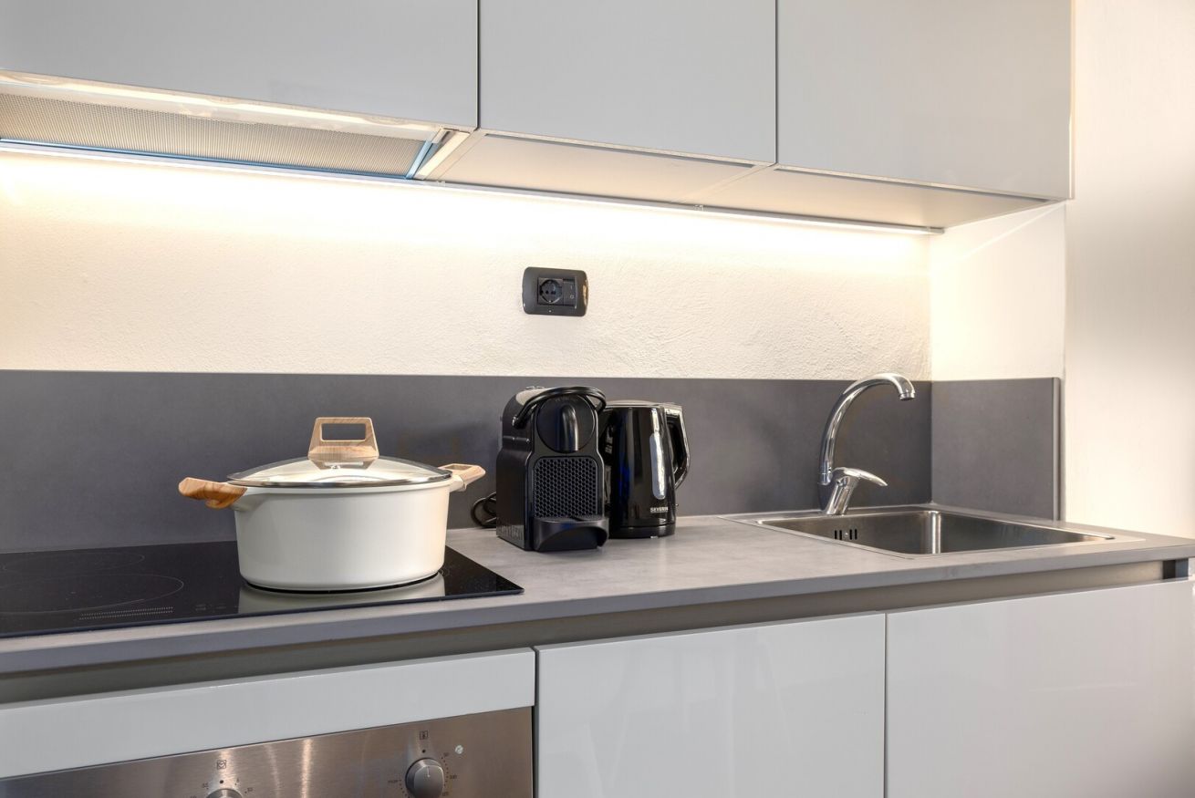 La cucina, moderna e completamente attrezzata con utensili ed elettrodomestici di alta gamma, si affaccia direttamente sul bellissimo terrazzo privato, un vero plus per chi desidera uno spazio esterno riservato nel cuore di Lucca: arredato con poltrone e tavolino, è il luogo perfetto per colazioni all’aperto, aperitivi al tramonto o semplici momenti di tranquillità.