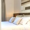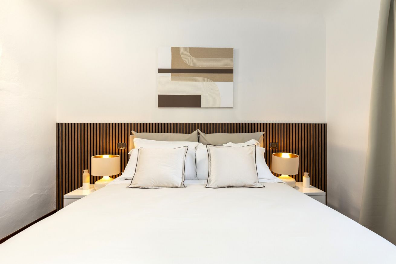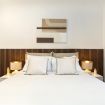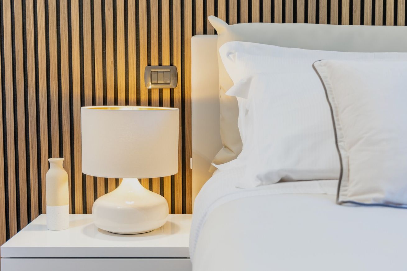 La camera da letto principale è un’oasi di intimità e design, con un letto matrimoniale dotato di materasso premium, pannelli in legno che valorizzano la parete retroletto, luci soffuse e una scrivania sospesa ideale anche per lavorare da remoto.