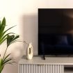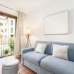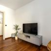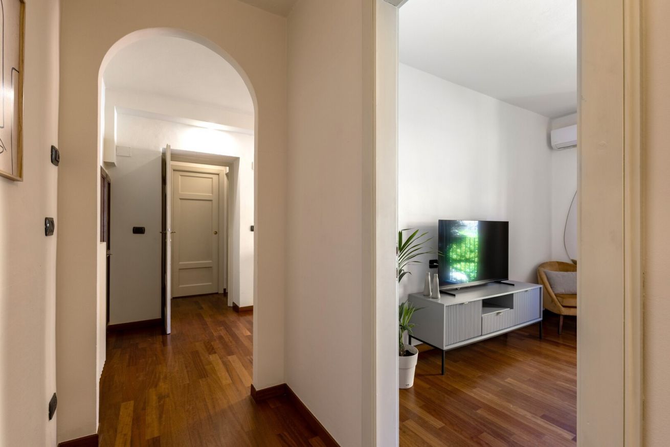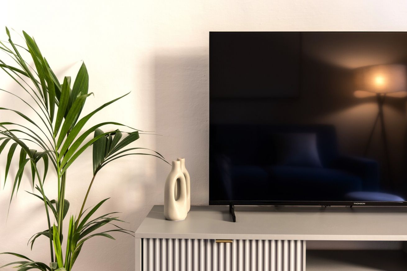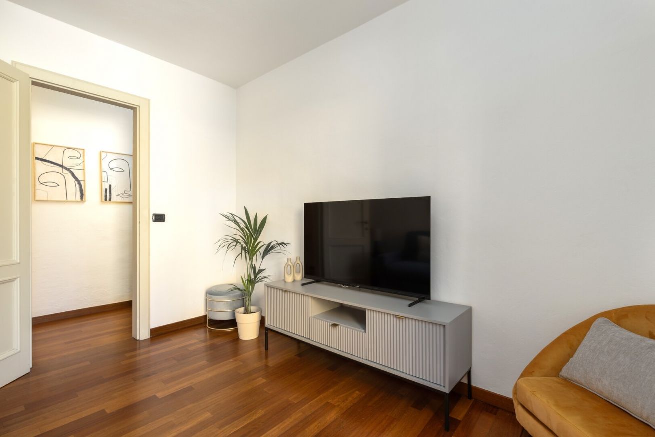 L’ampia zona living accoglie gli ospiti con un divano letto di design, una poltroncina minimal, la scenografica pianta Kenzia e una smart TV da 60 pollici, ideale per momenti di relax dopo una giornata alla scoperta della città.