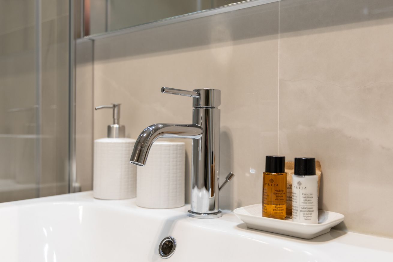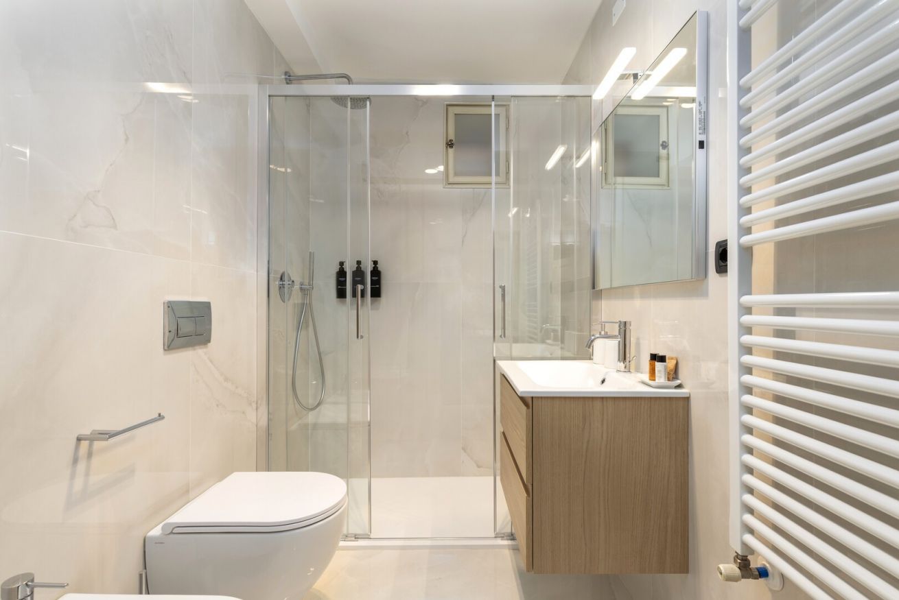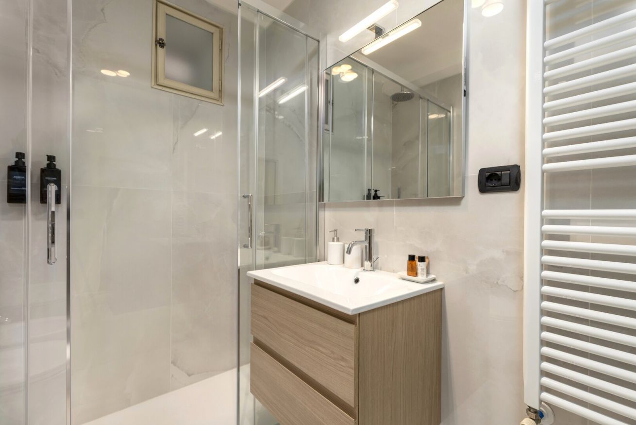 Il bagno, elegante e curato nei minimi dettagli, è rivestito in marmo chiaro e dotato di una spaziosa doccia a cascata, pensata per offrire una vera esperienza di benessere.