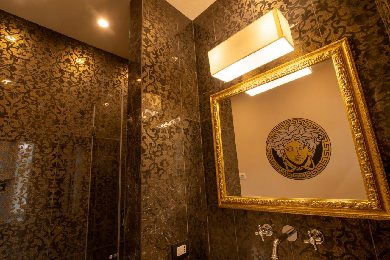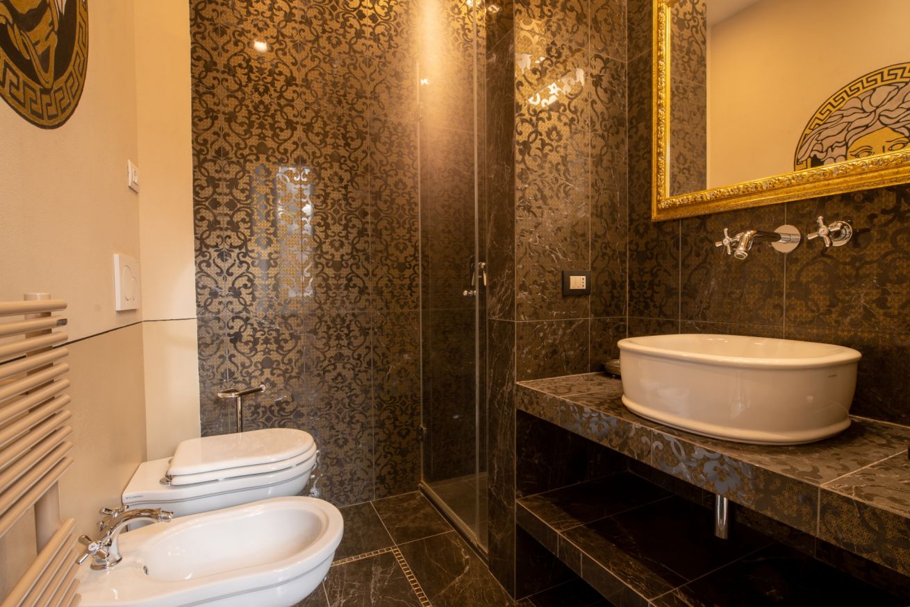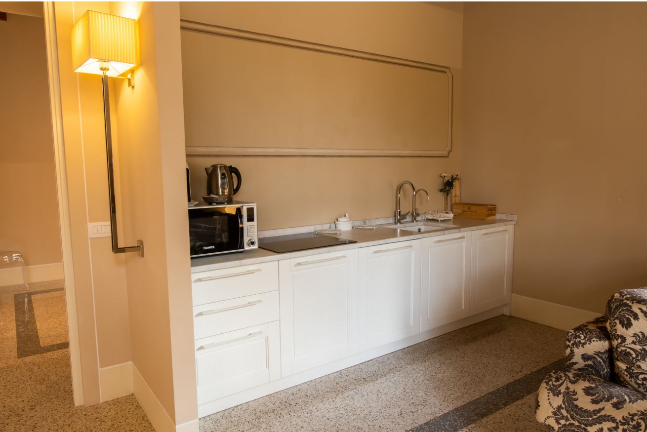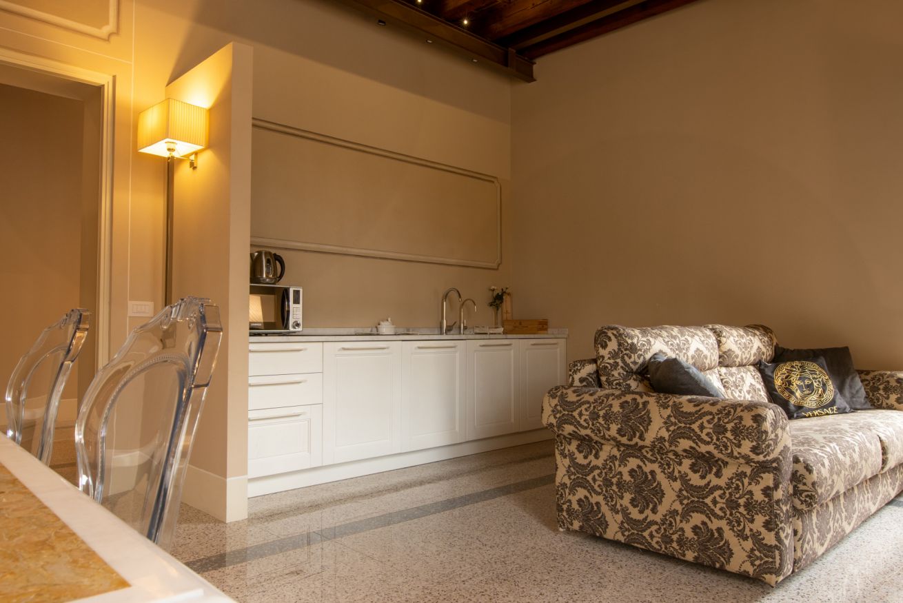 Nel soggiorno spazioso potrai rilassarti sul comodo divano letto mentre guardi la smart TV full HD da 55” o gusti un pasto al tavolo da pranzo in marmo bianco di Carrara. La cucina moderna e ben attrezzata ti invita a sperimentare la cucina italiana, con elettrodomestici di alta qualità, tra cui un bollitore, una macchina da caffè, microonde, lavastoviglie, frigorifero e lavatrice.