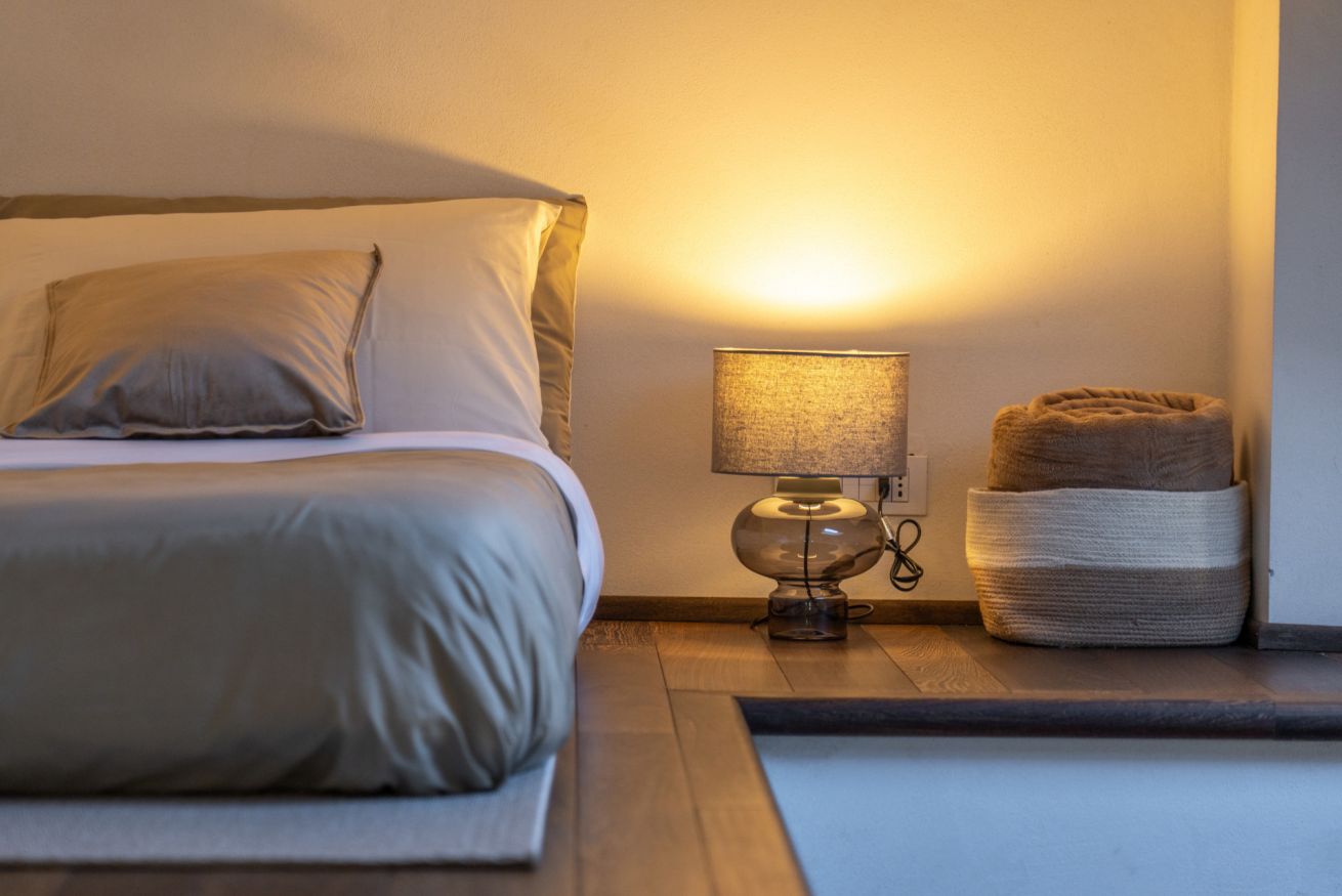 L'appartamento offre due camere da letto, ciascuna con un arredamento raffinato e funzionale. La camera principale, in stile giapponese, include un comodo letto, una scrivania per chi lavora da remoto e un bagno privato. La seconda camera, situata al piano superiore, presenta un letto in stile giapponese e una zona relax con pouf e tavolino, con vista sui tetti di Lucca che crea un'atmosfera suggestiva.